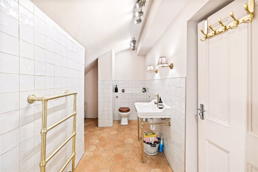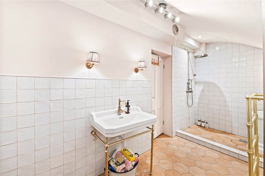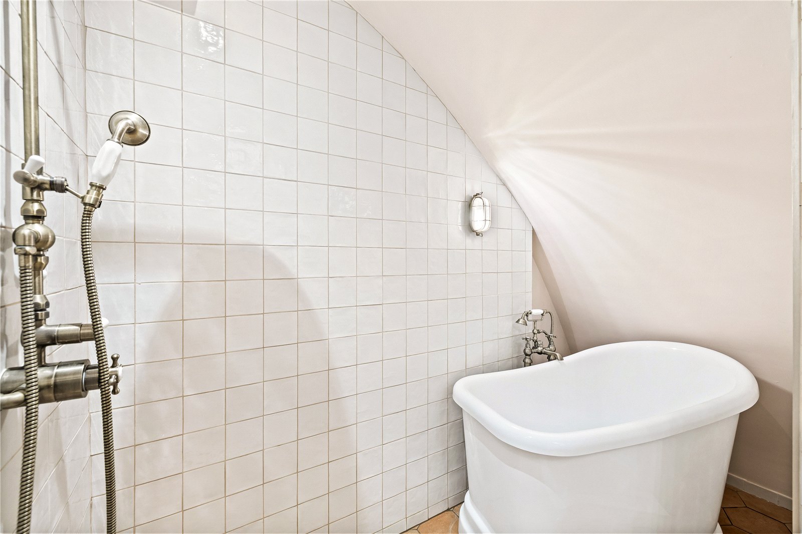 The bathroom, accessed from the living room, has been recently renovated with a careful balance of tradition and modern refinement. Soft blush walls, classic tiling and a Victorian-style freestanding bath sit alongside a WC and basin, complemented by a contemporary Italian shower. Traditional-style lighting with dimmer controls completes the space, creating a calm and beautifully considered setting for everyday comfort.