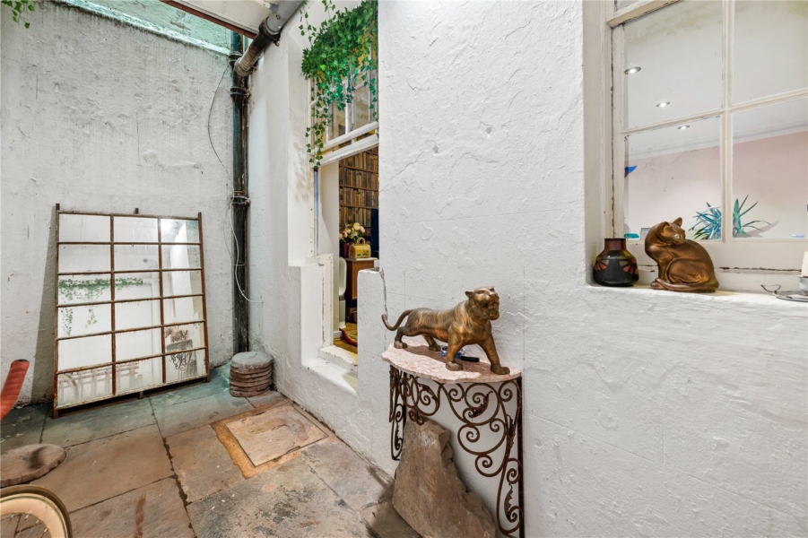 A discreet hatch beneath one of the sash windows lifts to provide access to the covered courtyard. This charming outdoor area works wonderfully as a sheltered summer extension of the living space and offers an attractive outlook year-round.