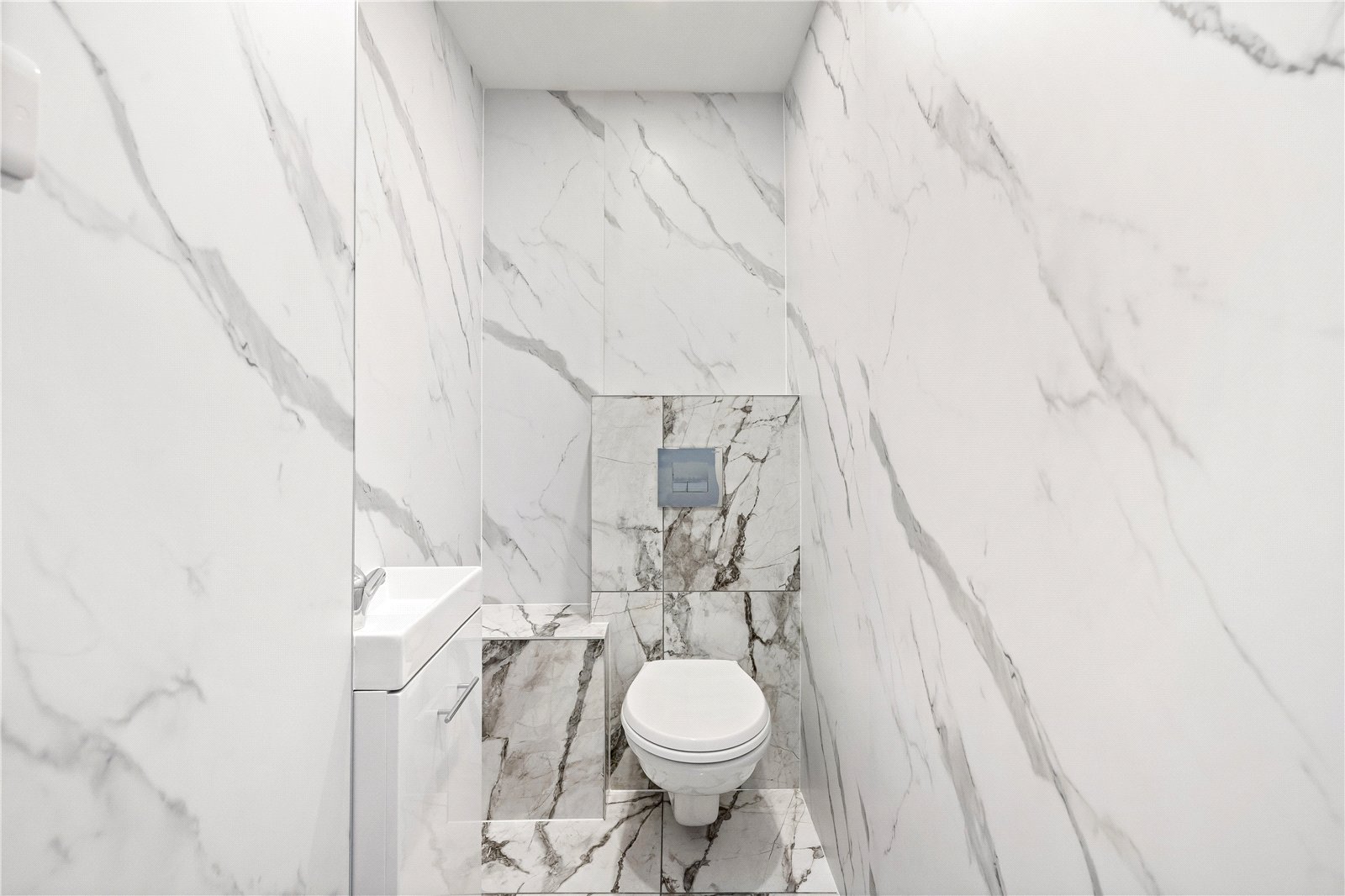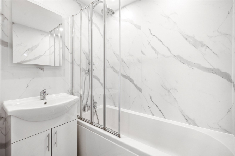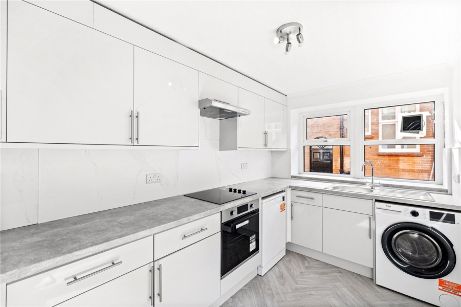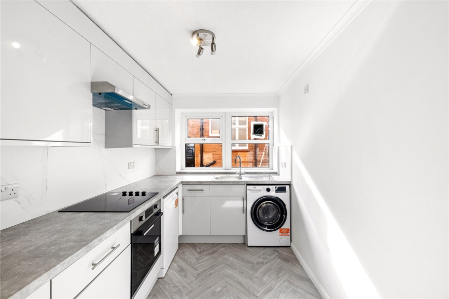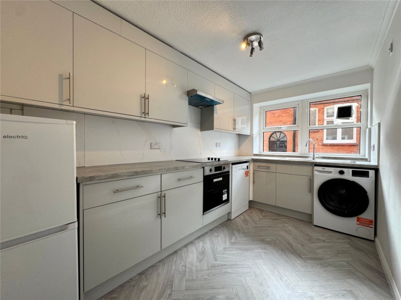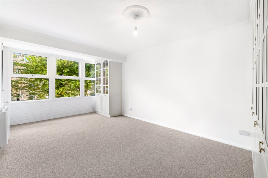 Inside, the flat is finished to a high standard throughout. The contemporary fitted kitchen includes all modern appliances, such as a washer dryer and dishwasher, while the generous living room features a lovely bay window that fills the space with natural light. From here, doors open onto a private west-facing balcony – the perfect spot to enjoy the afternoon sun.
