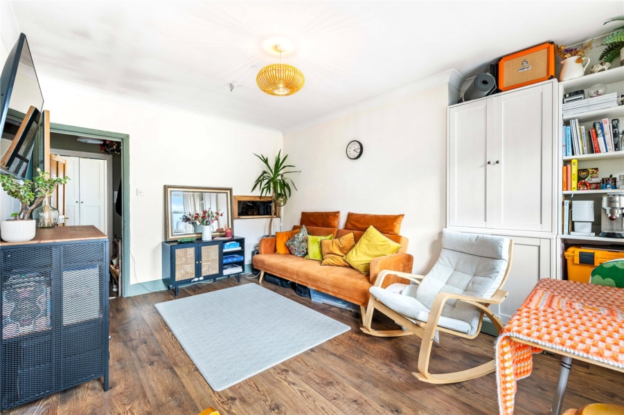 The main bedroom is a generously sized double, and there’s a separate fitted kitchen and a well-presented bathroom, all accessed via a central entrance hall.