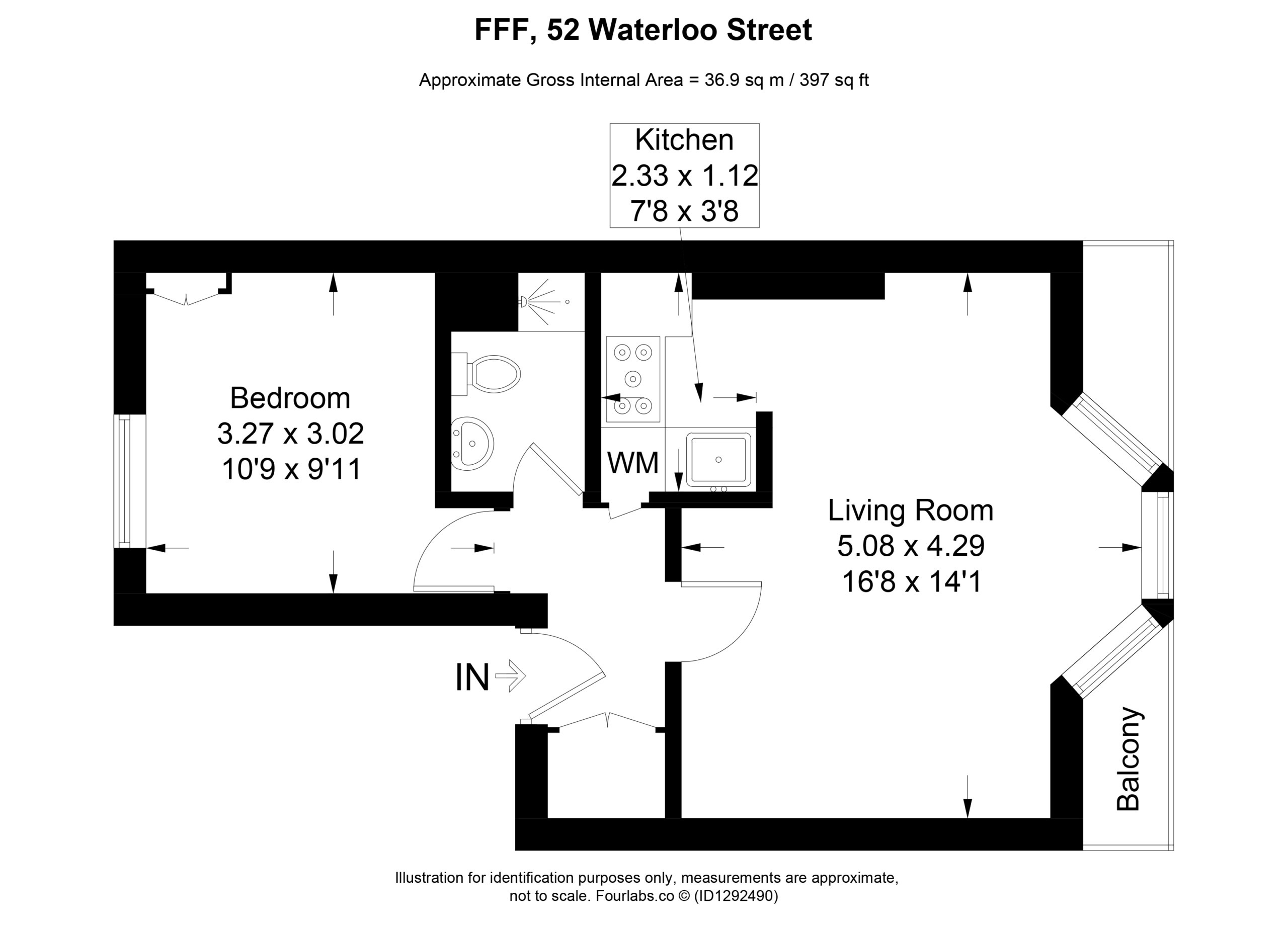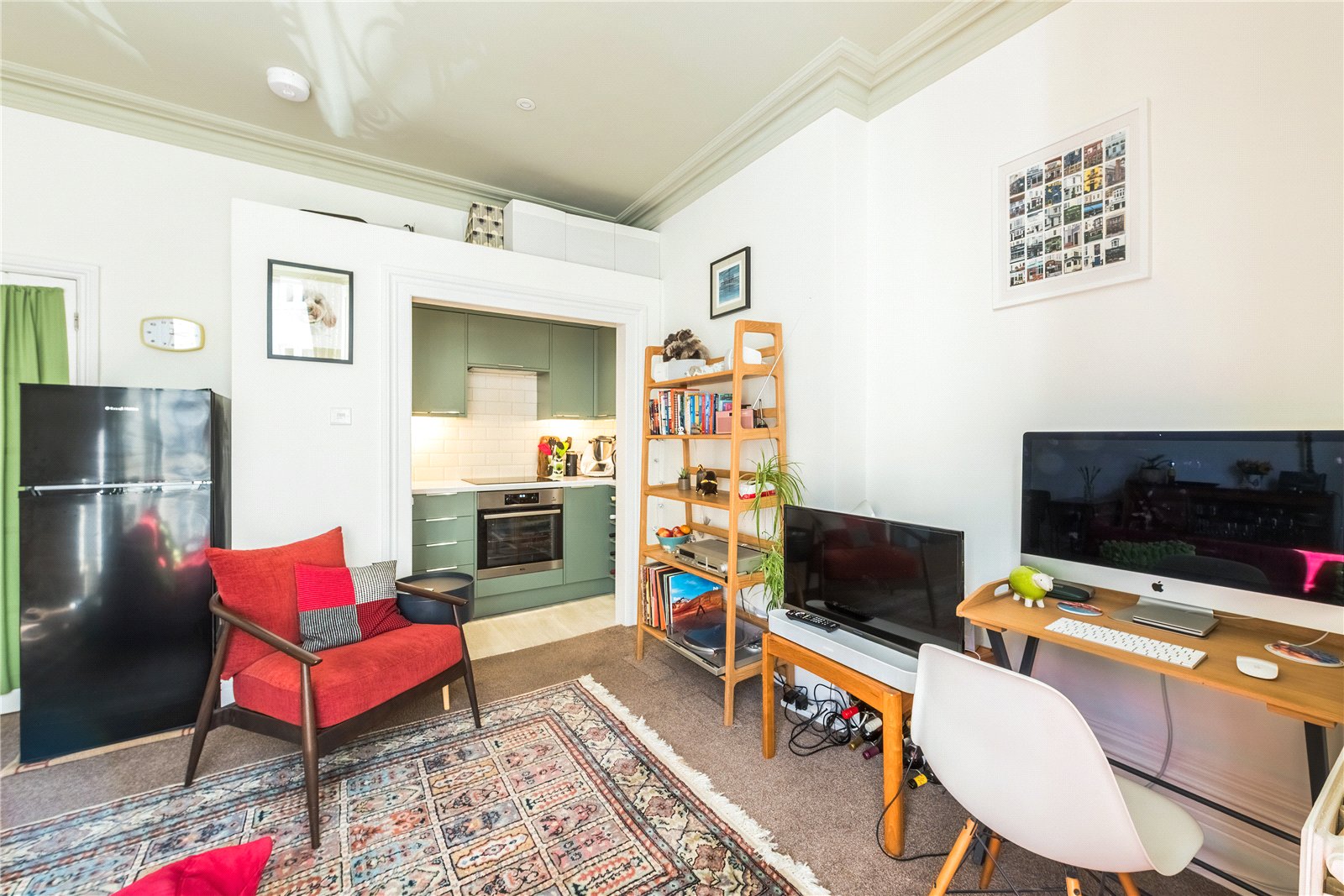The separate kitchen is efficiently laid out adjacent to the living space, while the double bedroom (measuring over 10 ft) sits quietly to the rear of the apartment, offering a peaceful and comfortable retreat. A bathroom and additional storage, including space for a washing machine, are conveniently positioned off the central hallway.