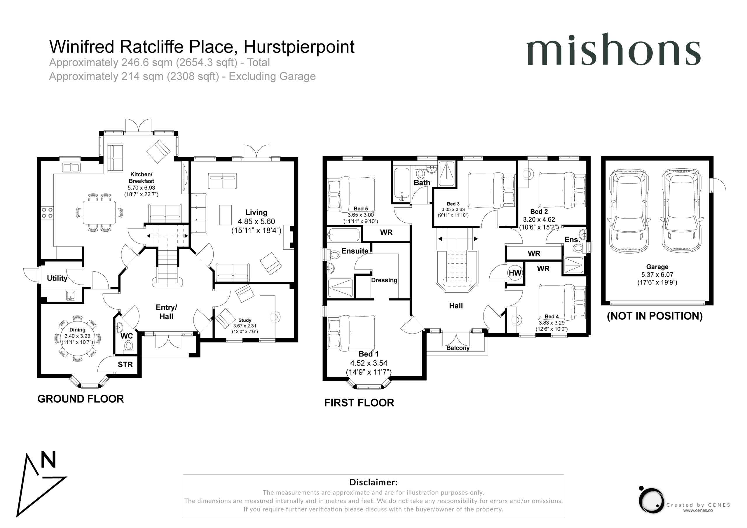 Upstairs, the master bedroom has a dressing area leading to an en suite shower room, with a second bedroom also benefiting from an en suite. Three further bedrooms are served by the family bathroom. The rooms are arranged around a spacious central landing, which features doors opening onto a balcony overlooking the front of the property.